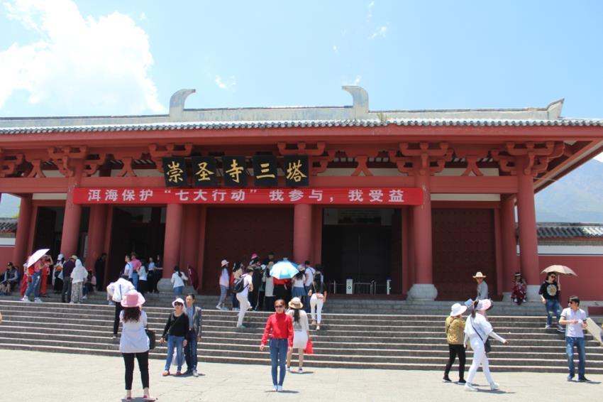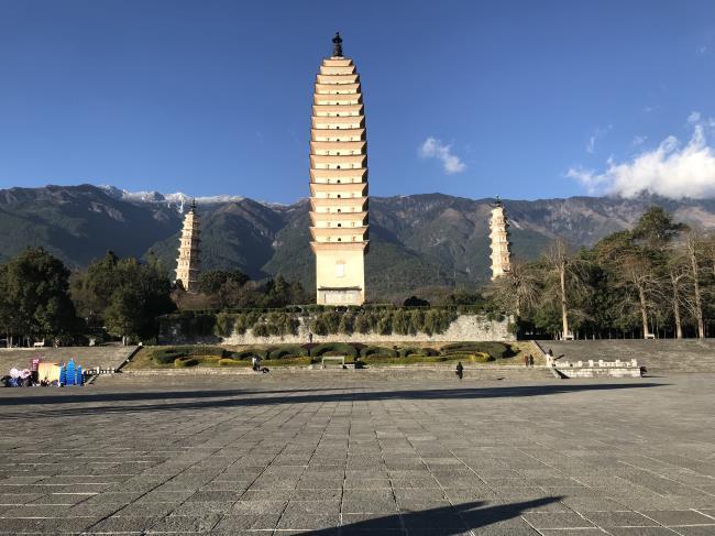 is located 14 kilometers away from Xiaguan, 1.5 kilometers north of Dali at the foot of Cangshan Yingle Peak.Chongsheng Templeis backed by Cangshan and faces Erhai Lake. The base of the three towers of Chongsheng Temple is square, surrounded by stone railings, with stone lions carved on the four corners of the railings. In the center of its east side, there is a stone wall with the words "Yongzhen Shanchuan" written on it, which is quite impressive. The main tower of the Three Pagodas is called Qianxun Pagoda, which is a square 16 story closely eaved tower with a bottom width of 9.9 meters and a height of 69.13 meters. The top of the tower is covered with a copper bowl, and a tower brake is placed on top. It is a typical building of the Tang Dynasty, similar to the Xi'an Big and Small Wild Goose Pagoda